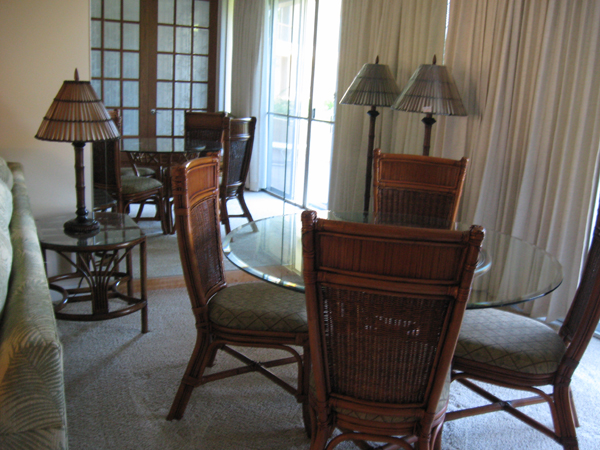 Dining Area, Sofa, Dresser and Flat Screen TV ![]() ![]() Bedroom with two Cal-King beds and a half bath.